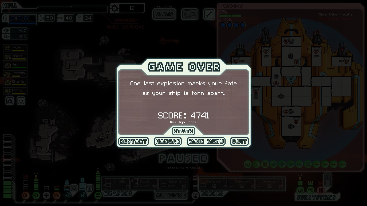 | Posted: 24 Jun 2021 12:30 PM PDT Successful stealth cruiser victory after a couple weeks of trying. Fully upgraded engines, defense drone II, and hull repair drone were essential (in addition to, of course, a fully upgraded cloak). Weapons were Vulcan, Flak II, and small bomb. Together with a mind control unit to get rid of evasion, taking down the flagship's shields wasn't too bad. Still, the drone stage of the flagship was quite a challenge, because you take an incredible amount of damage during the drone power overload, and the cloak doesn't recharge quickly enough to completely avoid the overloads (I had to jump to a nearby star, fully repair with the hull drone, then jump back). [link] [comments] | ||